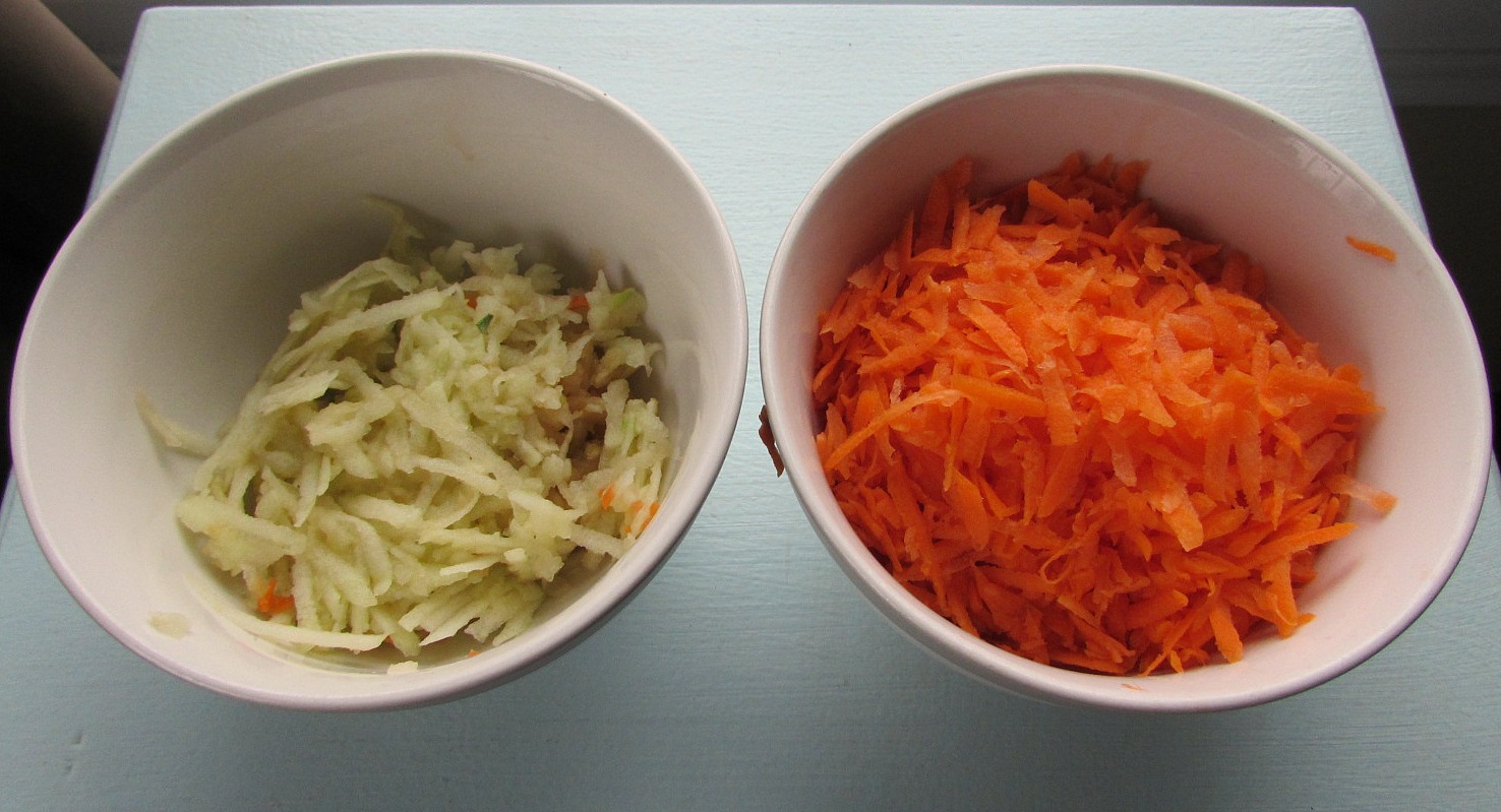 - Peel and grate the carrot and apple.