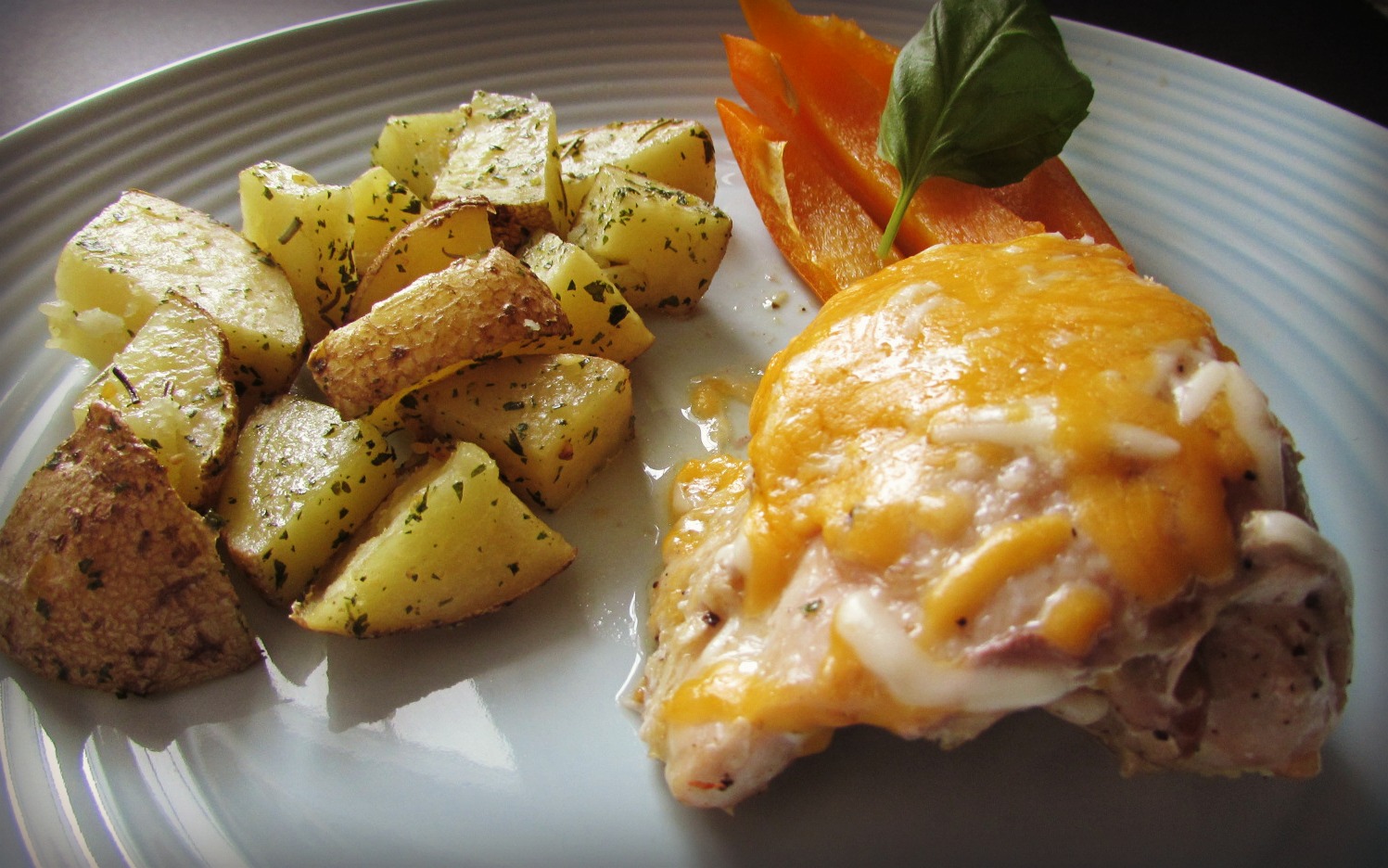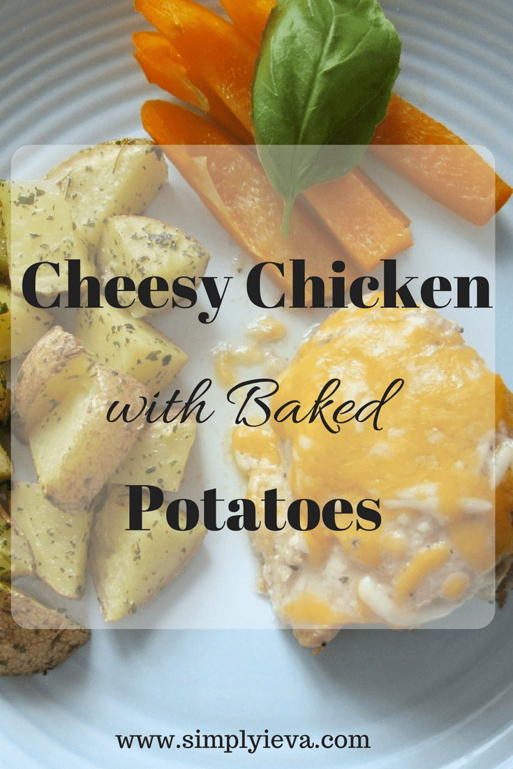 This dinner is quickly made if you have a double oven, because as soon as you put in the chicken, you can work on potatoes and all parts of the dinner will be ready at the same time. If you don’t, you can cook both at the same temperature, except it might take potatoes longer to cook under 375 F, or chicken will be ready sooner if cooked at 400F.